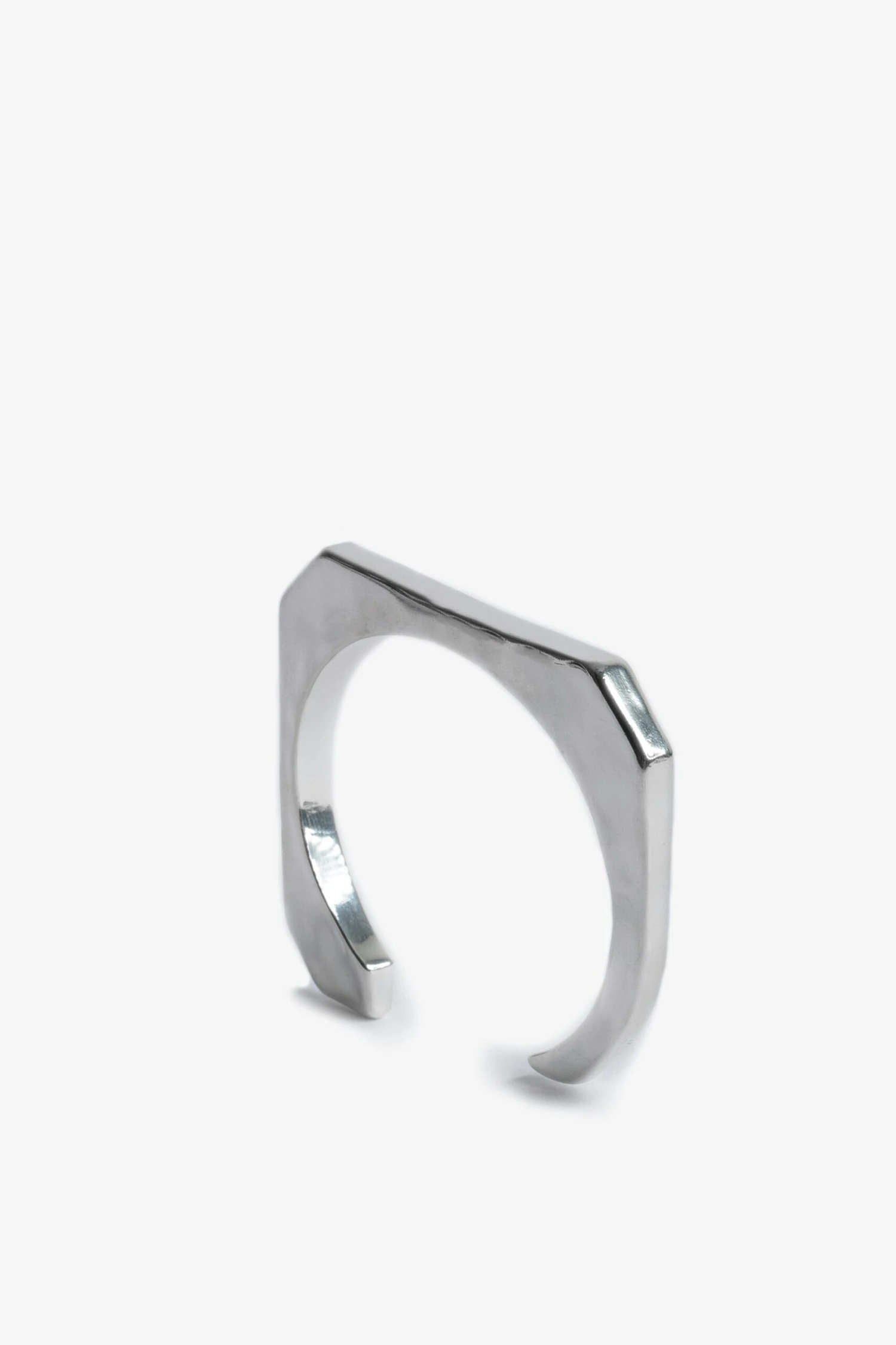 Rigid and open C-shaped bangle in hammered gold and silver-tone brass.
