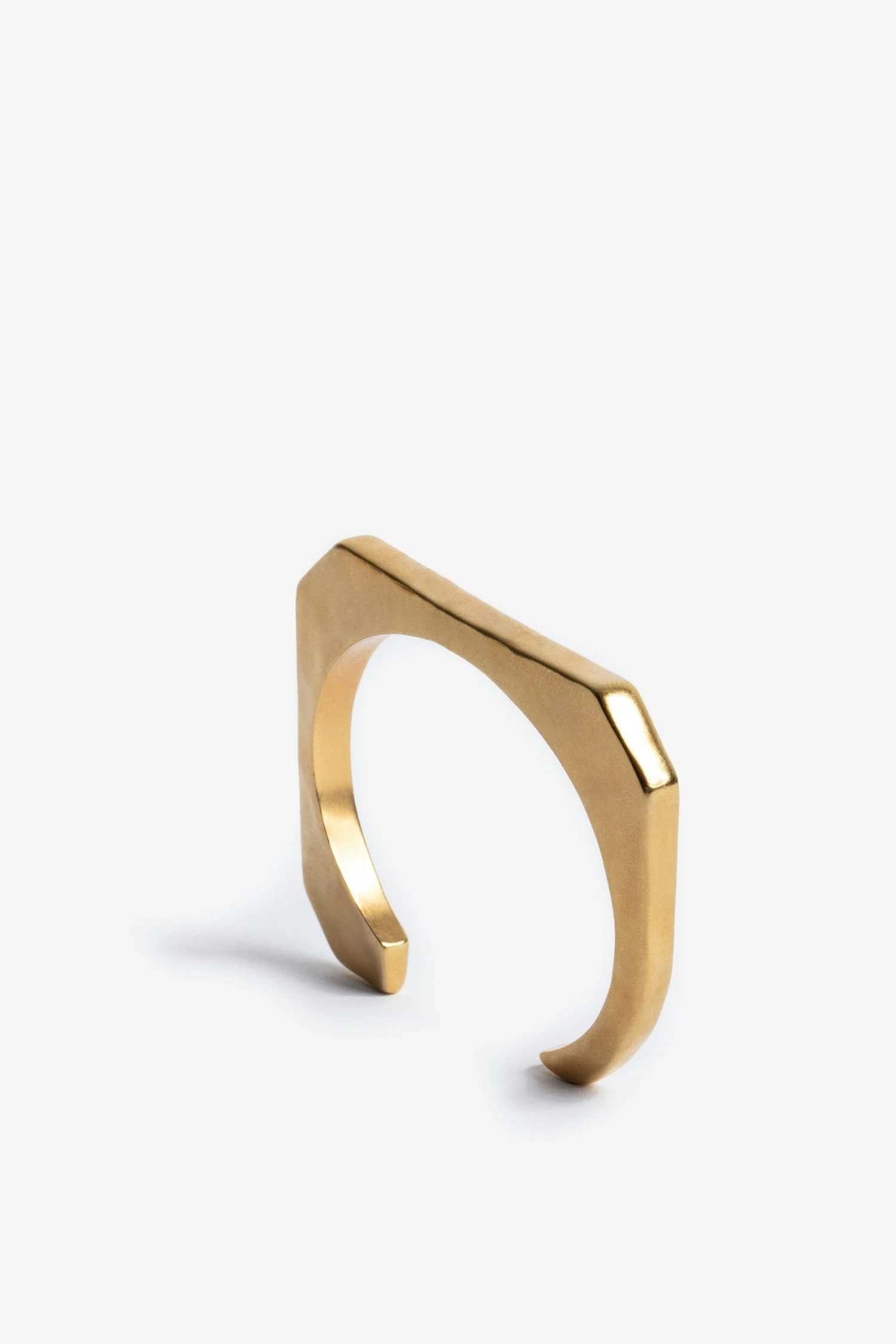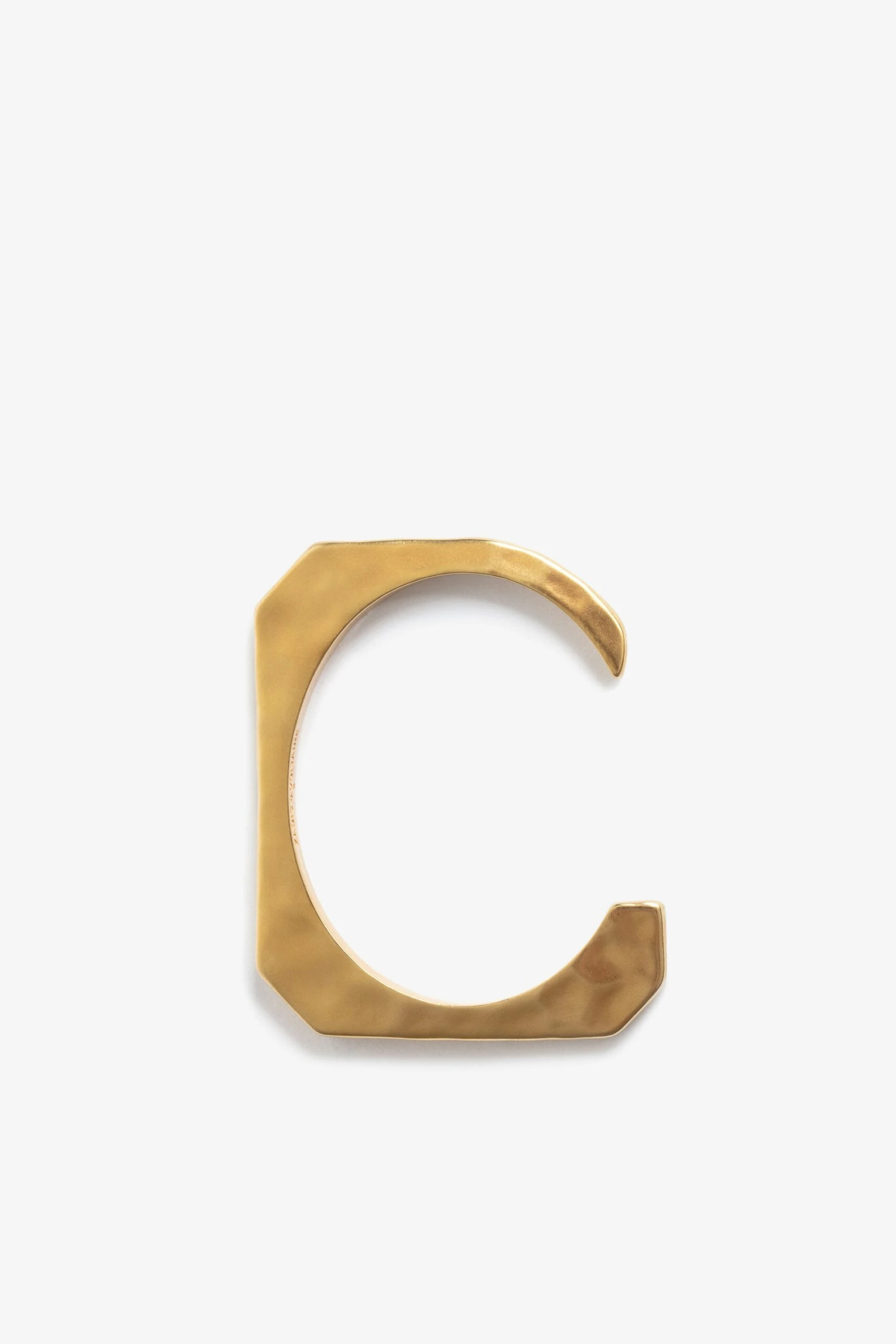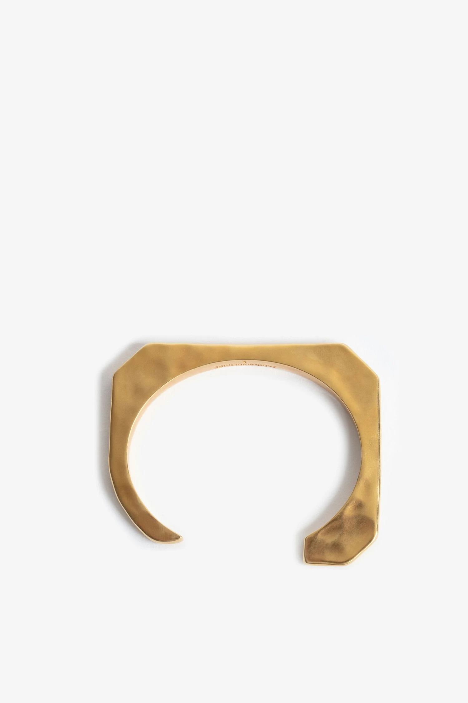 Rigid and open C-shaped bangle in hammered gold and silver-tone brass.