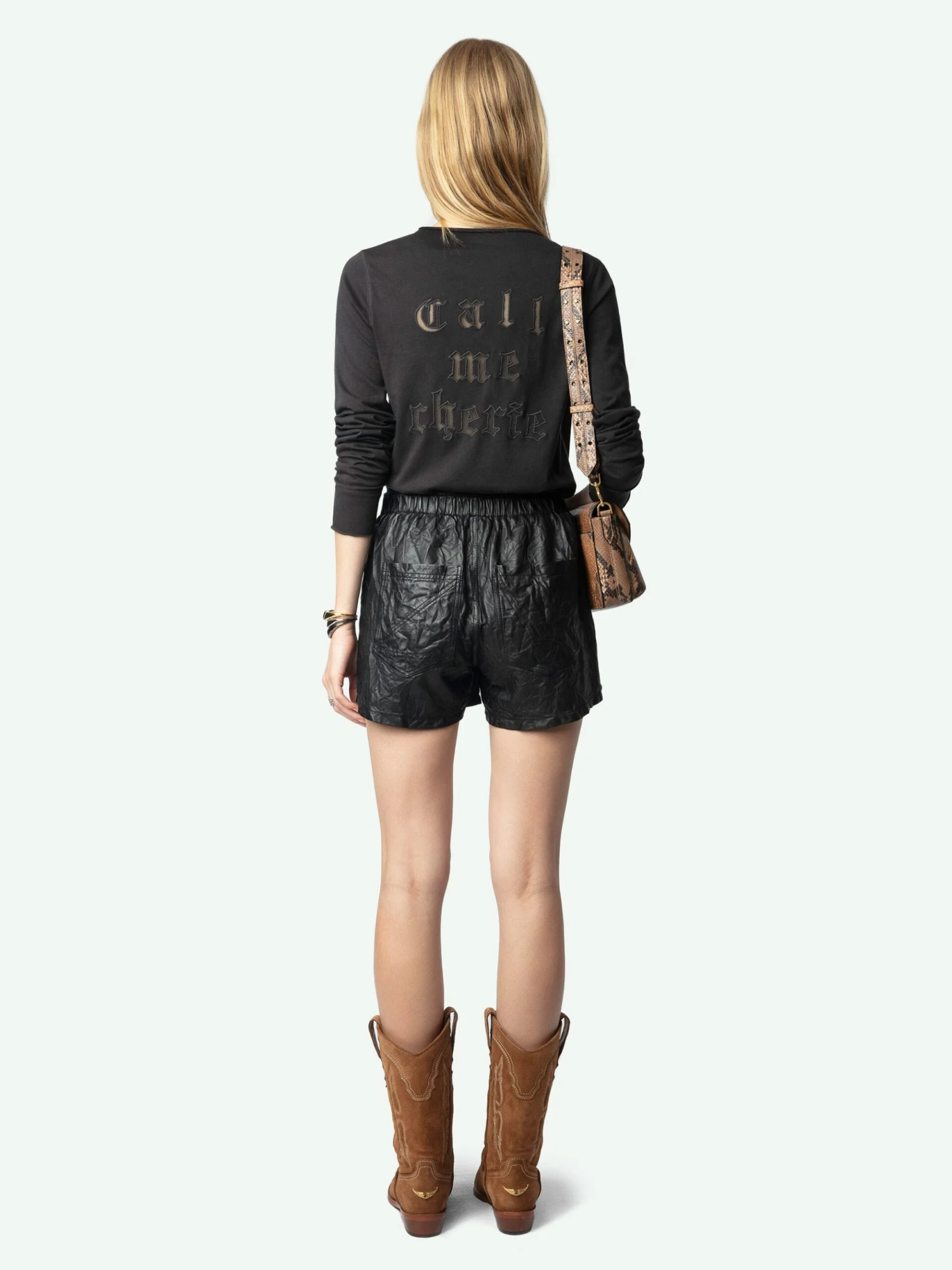 – Fishnet “Call Me” embroidery at the back