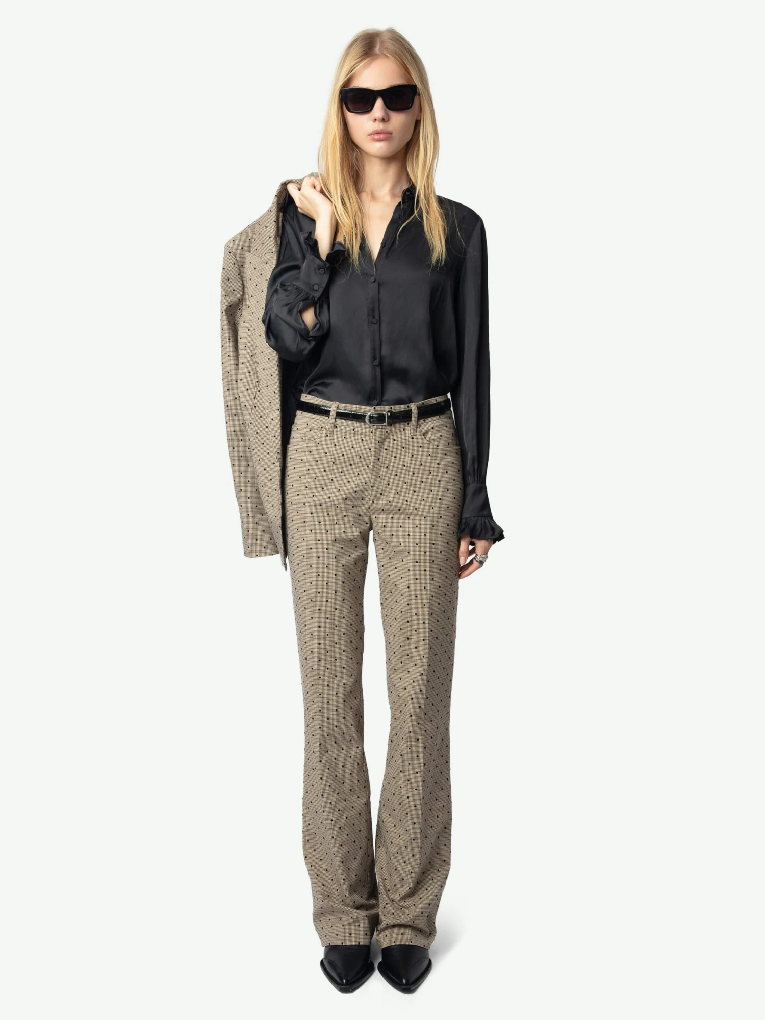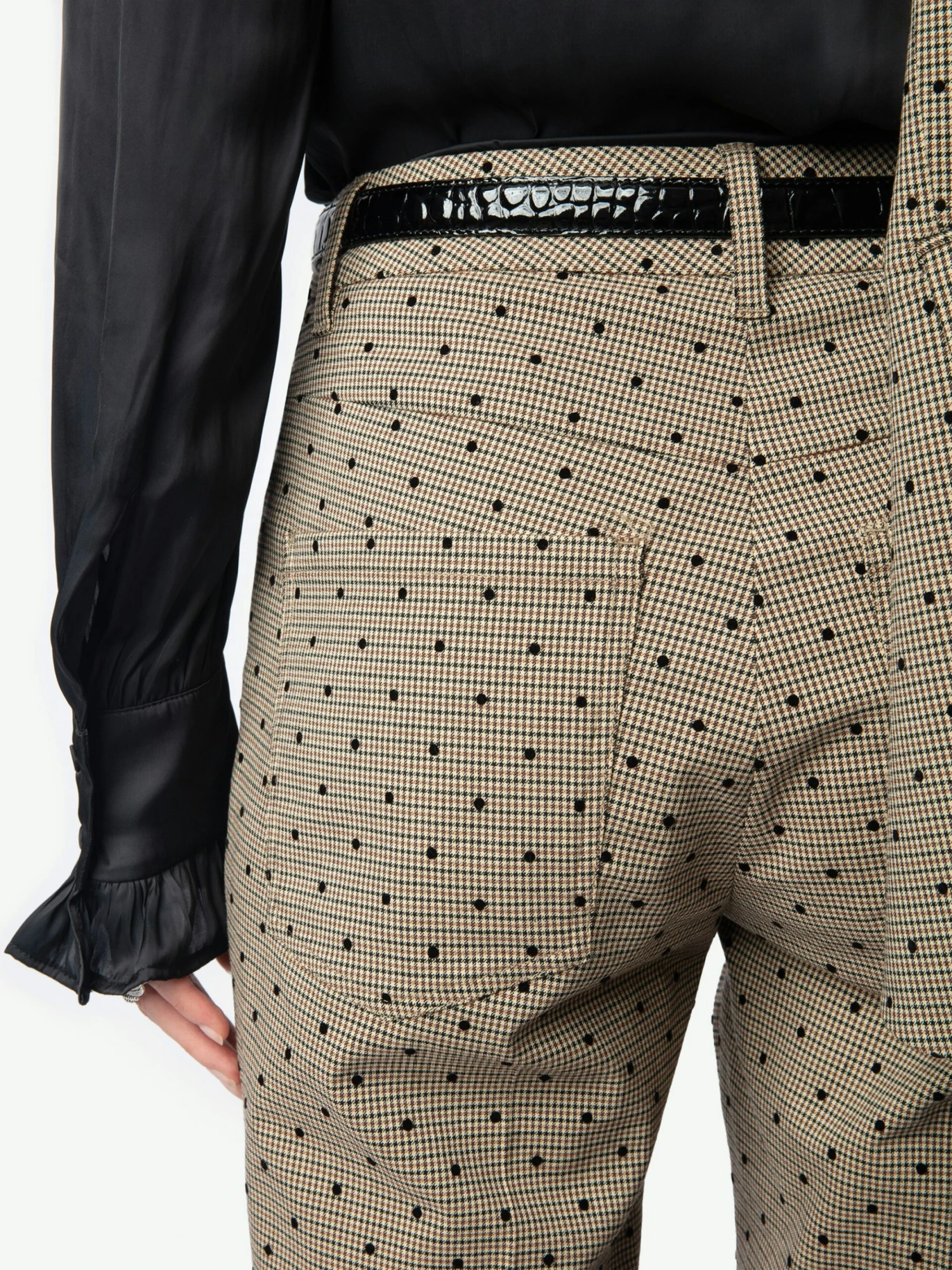 – Checked print with flocked polka dots
