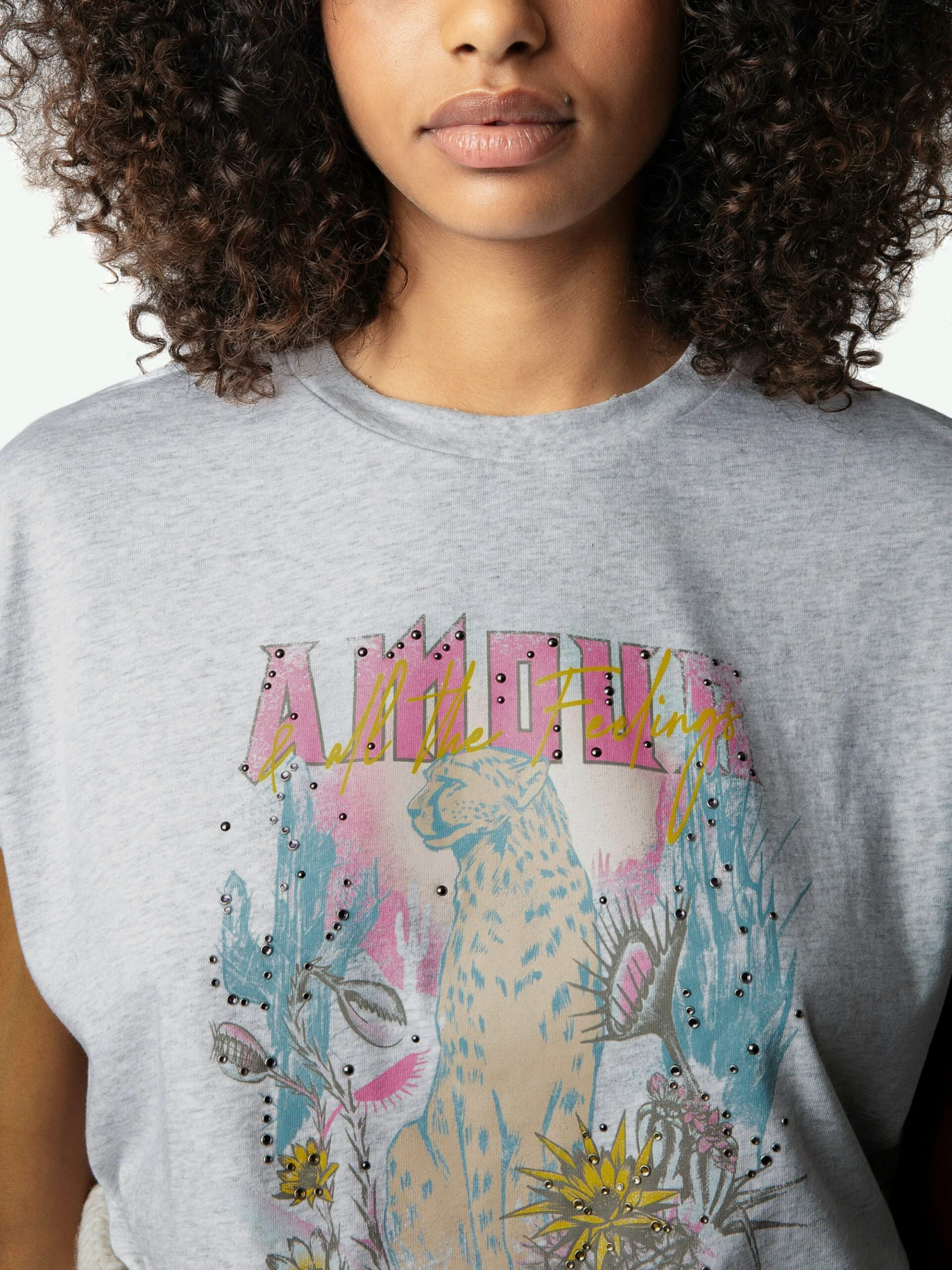 – Worn-effect “L’Amour & All The Feelings” Cheetah print on front and Concert print on back